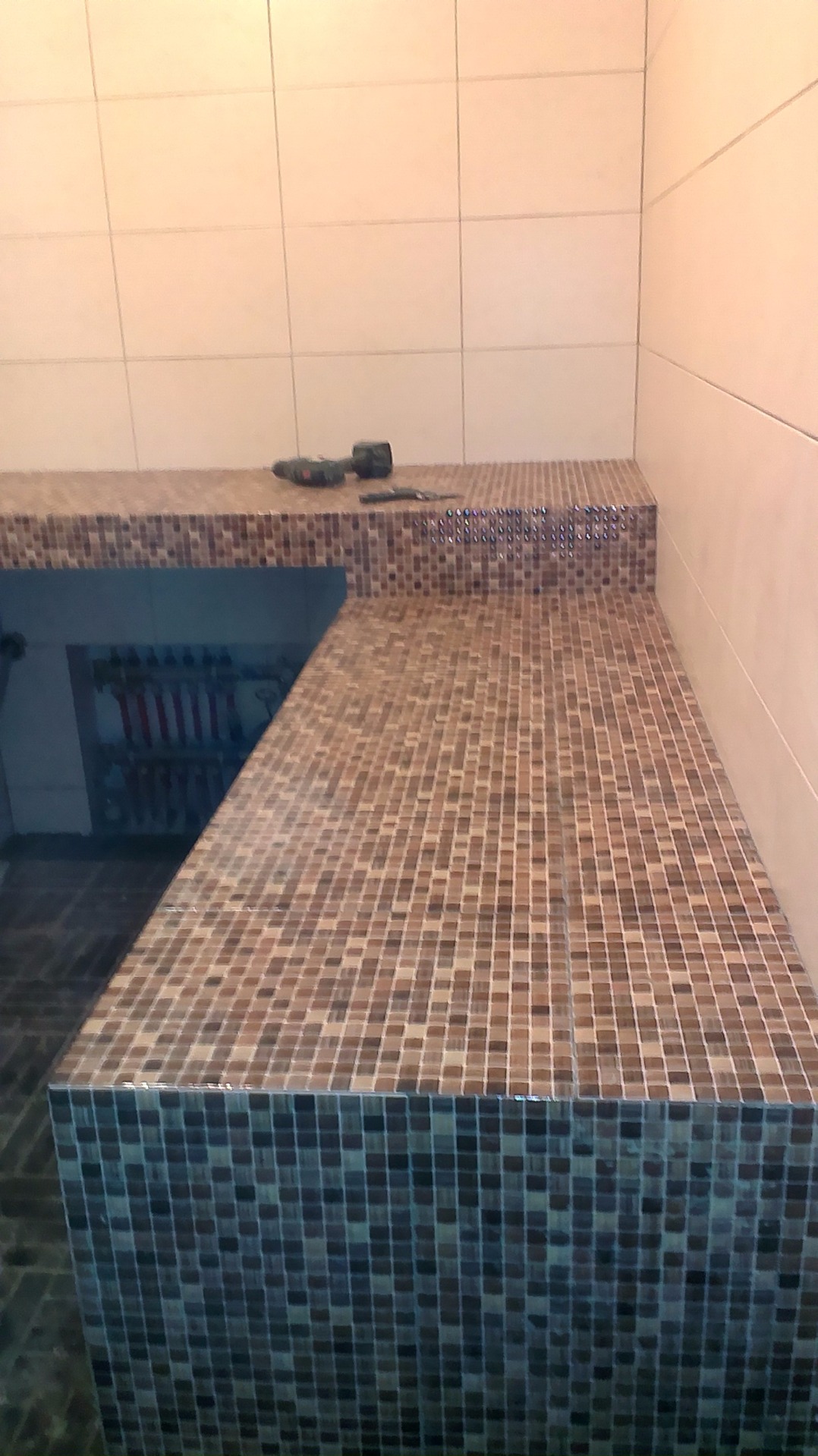 Ремонт ванной комнаты.облицовка плиткой.запил угла под 45*.замена сантехники.полный монтаж душевой кабины.навес умывальника.подключение стирал машины.натяжной потолок.-